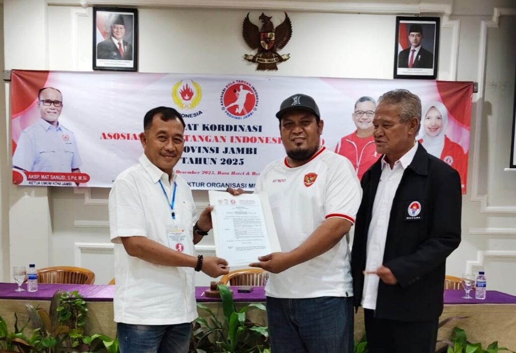 Kota Jambi — Darmawan, S.Kom resmi menerima Surat Keputusan (SK) sebagai Ketua Asosiasi Bola Tangan Indonesia (ABTI) Kota Jambi untuk periode 2025–2029. Penyerahan SK tersebut dilakukan langsung oleh Sekretaris ABTI Provinsi Jambi, Habib Syukri Baraqbah, dalam agenda Rapat Koordinasi (Rakor) ABTI Provinsi Jambi yang digelar di Ratu Hotel dan Restoran pada Senin, 29 Desember 2025.